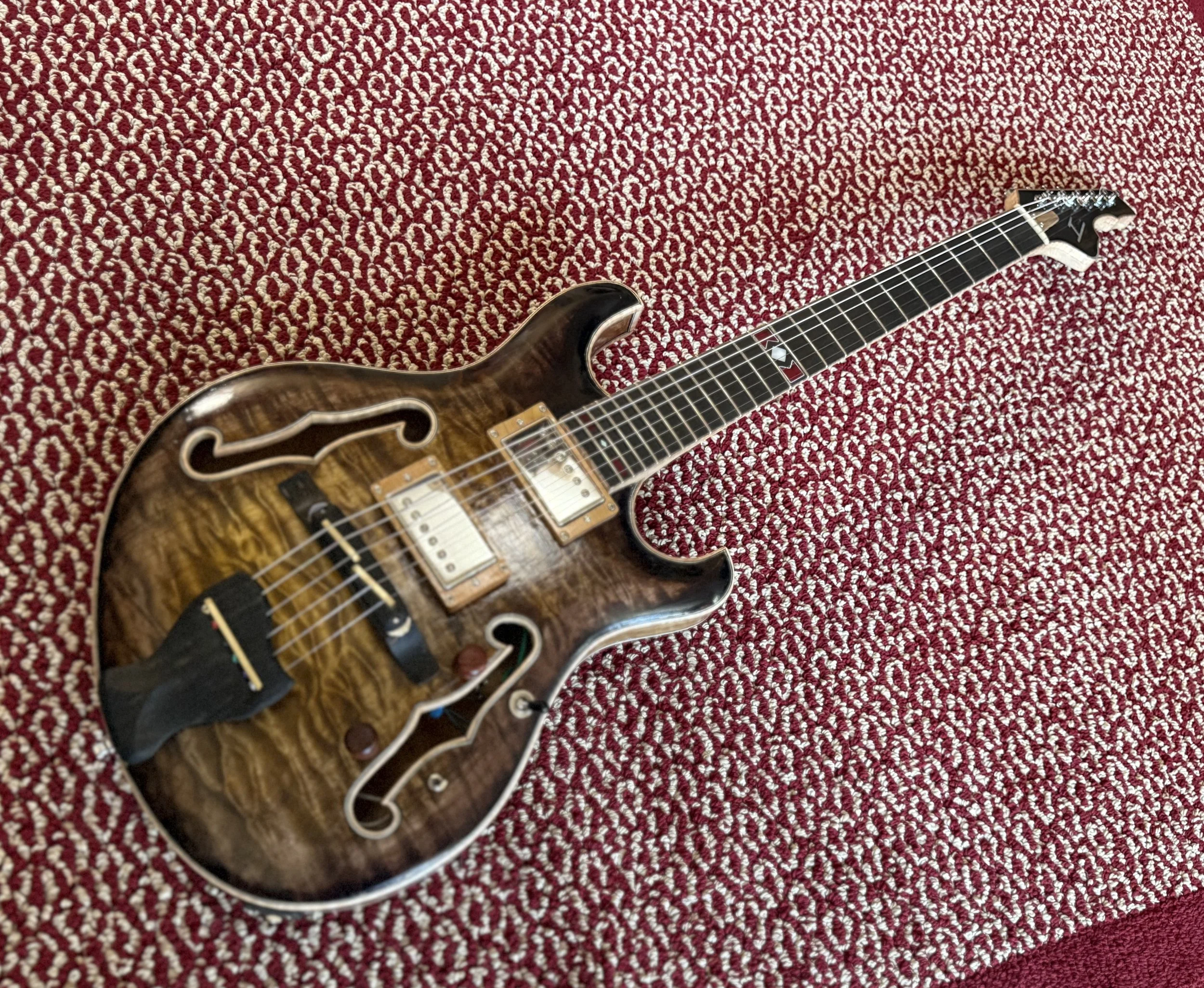 steam bending the sides and using a seperate top and back. The M4 body is a strat sized body blank that I carve hollow, and cap with a top: the body blank serves as the back and sides.